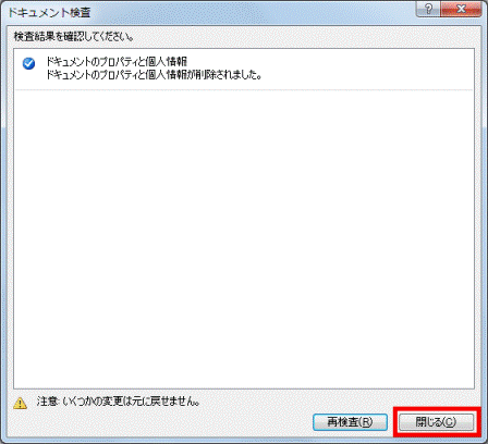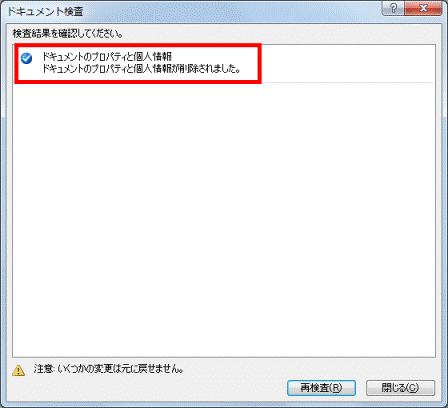 - 「ドキュメントのプロパティと個人情報が削除されました。」と表示されたことを確認します。