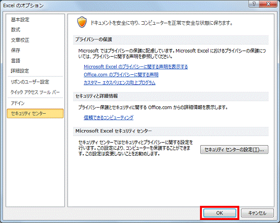 - 「OK」ボタンをクリックし、「セキュリティセンター」を閉じます。