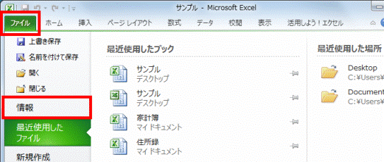 - 「ファイル」タブ→「情報」の順にクリックします。