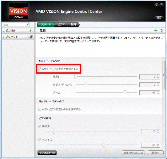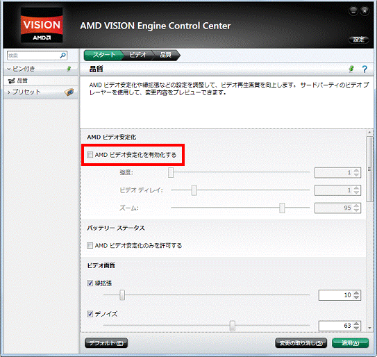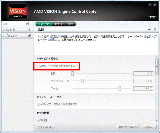 - 「AMDビデオ安定化」にある、「AMDビデオ安定化を有効化する」にチェックがないことを確認します。