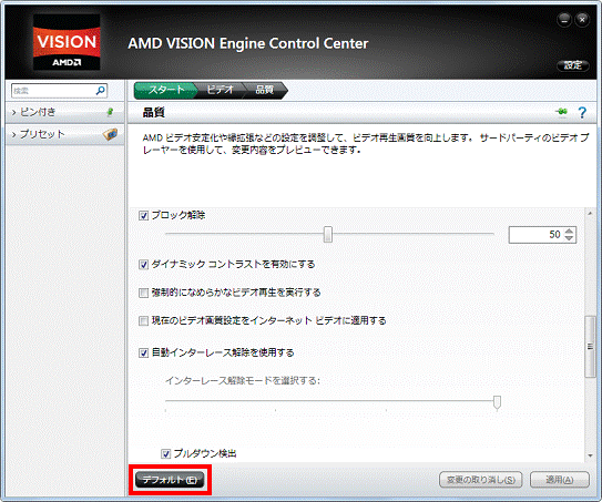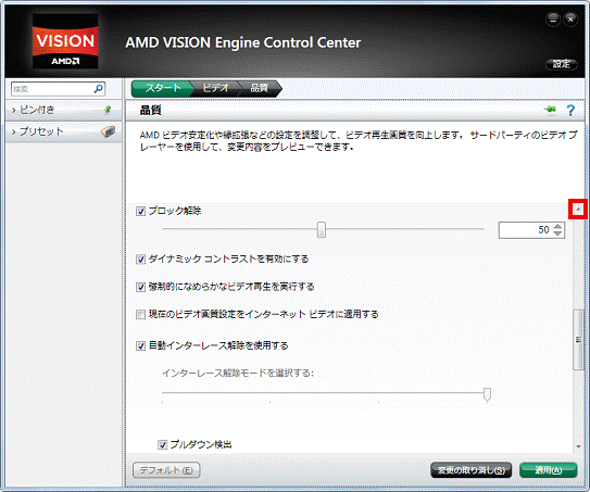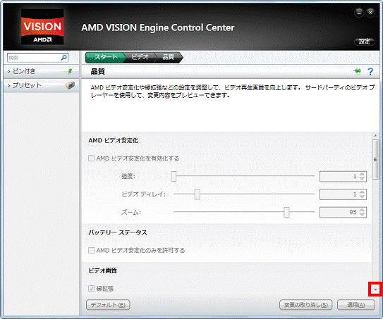 チェックがある場合は、「AMDビデオ安定化を有効化する」をクリックし、チェックを外します。