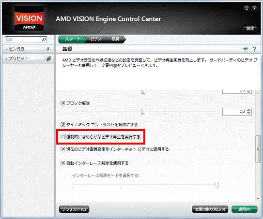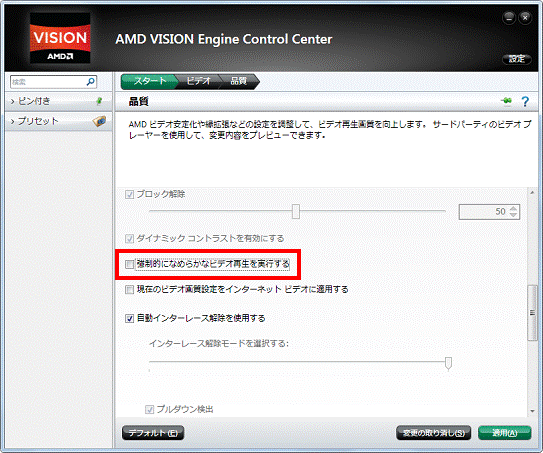- 「強制的になめらかなビデオ再生を実行する」にチェックがある場合は、クリックしチェックを外します。