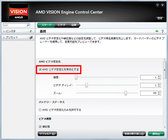 - 「AMDビデオ安定化」にある、「AMDビデオ安定化を有効化する」をクリックし、チェックを付けます。