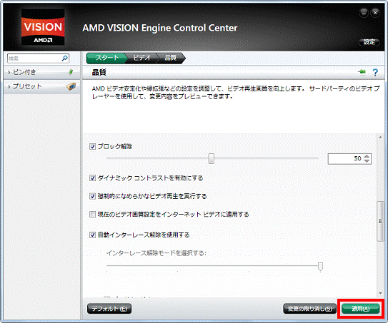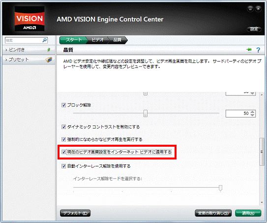 インターネット上の動画をぴったりビデオで再生したい場合は、上の設定に加え、「現在のビデオ画質設定をインターネットビデオに適用する」をクリックし、チェックを付けます。
