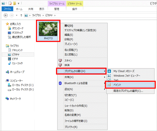 - トリミングする画像を右クリックし、表示されるメニューから「プログラムから開く」→「ペイント」の順にクリックします。