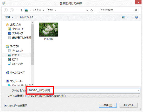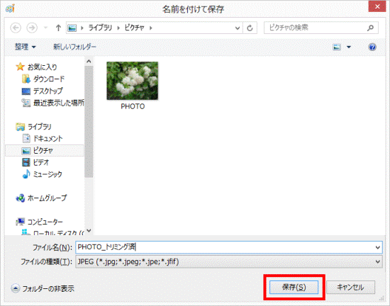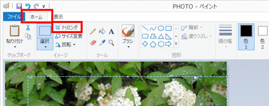 「ドラッグ」とは、マウスのボタンを押したままマウスを動かし、マウスポインターを目的の場所に移動させる操作です。 - 「ホーム」タブの「トリミング」ボタンをクリックします。
