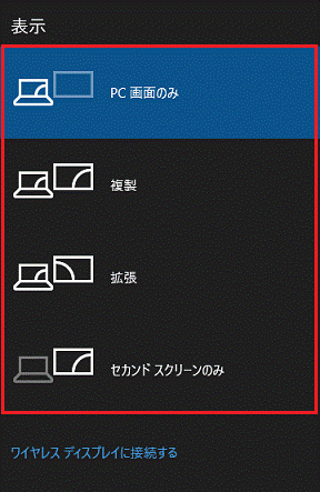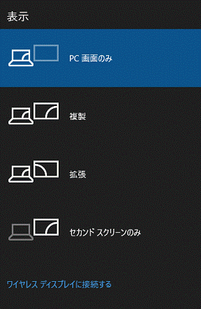 【Windows】キーを押しながら、【P】キーを押すと、「表示」(または「セカンドスクリーン」)が表示されます。