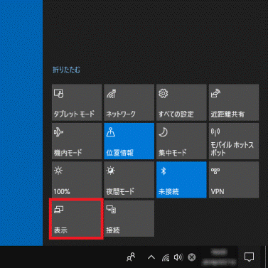 キーボードから切り替えられない場合は、アクションセンターの「表示」から、表示するディスプレイを切り替えます。