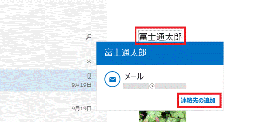 アドレス帳に登録したい差出人をクリックし、表示されるメニューから「連絡先の追加」をクリックします。