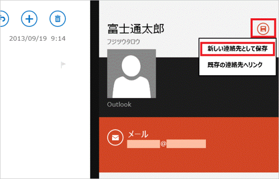 「保存」ボタンをクリックし、表示されるメニューから「新しい連絡先として保存」をクリックします。