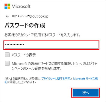 アカウントに設定するパスワードを入力し、「次へ」ボタンをクリックします。