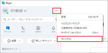 • Skypeからサインアウトしたいときは、画面の上にある「…」をクリックし、表示されるメニューから「サインアウト」をクリックします。