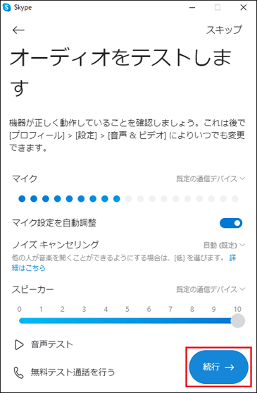 オーディオのテストを行い、完了したら「続行」ボタンをクリックします。