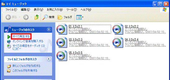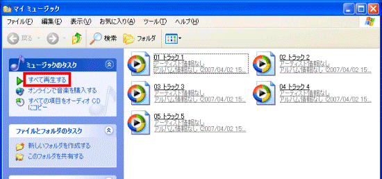 「ミュージックのタスク」の、「すべて再生する」をクリックします。