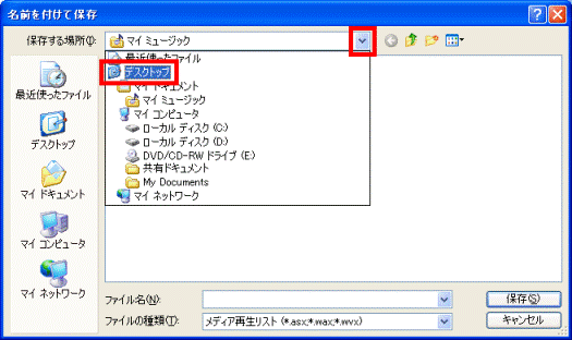 ここでは例として、音楽ファイルが保存されている場所を「マイ ミュージック」、再生リストを保存する場所を「デスクトップ」としてご紹介します。