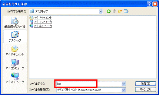 - 「ファイル名」に表示されているファイル名を削除し、作成する再生リストに付ける名前をお好みで入力します。