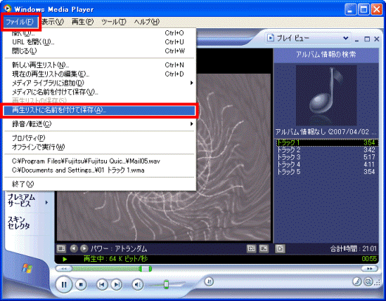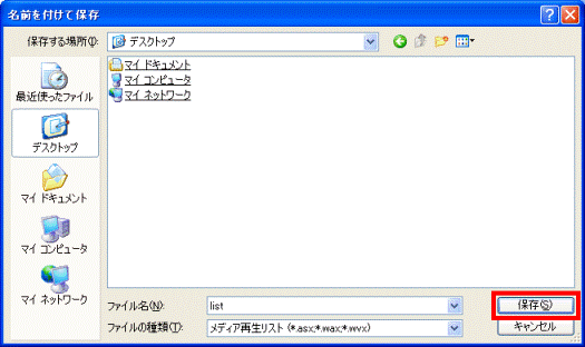 ドラッグとは、マウスのボタンを押したままマウスを動かし、マウスポインターを目的の場所に移動させる操作です。 - 「ファイル」メニュー→「再生リストに名前を付けて保存」の順にクリックします。