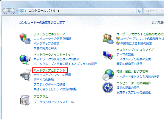 「ハードウェアとサウンド」をクリックします。