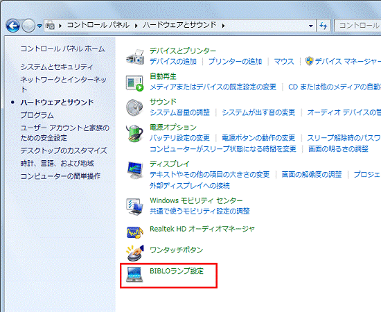 表示方法が「大きいアイコン」または「小さいアイコン」の場合は、「BIBLOランプ設定」をクリックし、手順4.へ進みます。 - 「BIBLOランプ設定」をクリックします。