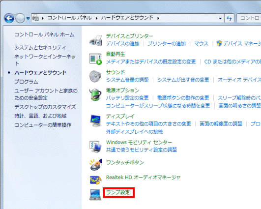 表示方法が「大きいアイコン」または「小さいアイコン」の場合は、「ランプ設定」をクリックし、 手順4.へ進みます。 - 「ランプ設定」をクリックします。