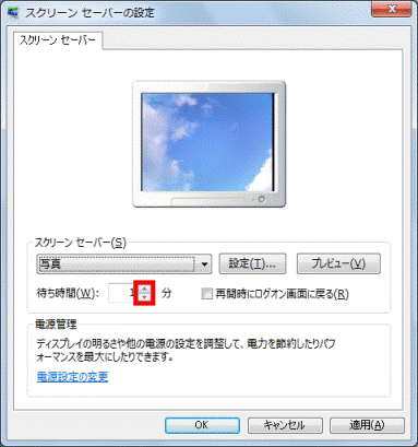 - 「待ち時間」の「▲」ボタンや「▼」ボタンをクリックして、スクリーンセーバーが起動するまでの時間を設定します。