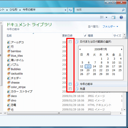 「名前」「更新日時」などの見出しの右側にあるチェックマークをクリックします。