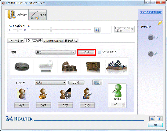 「Realtek HD オーディオマネージャ」で、サウンドエフェクトの設定をリセットします。