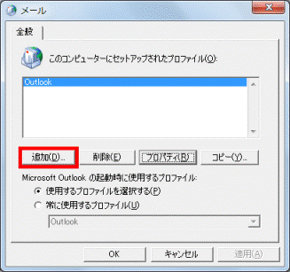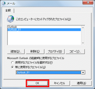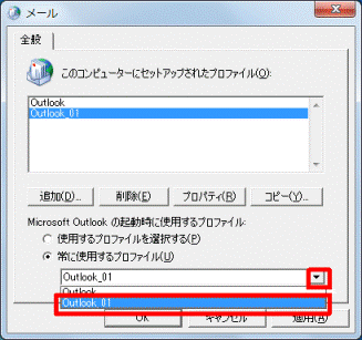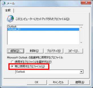 今まで送受信したメッセージをご覧になる場合は、「常に使用するプロファイル」欄で、電子メールプロファイルを切り替えてください。