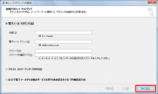 ここでは電子メールアカウントを設定せず、「キャンセル」ボタンをクリックします。