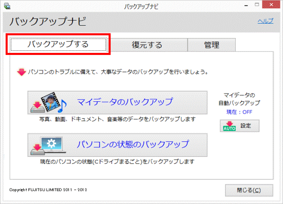 この画面が表示されない場合は、次の手順に進みます。 - 「バックアップする」タブをクリックします。