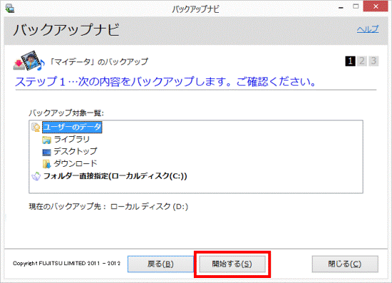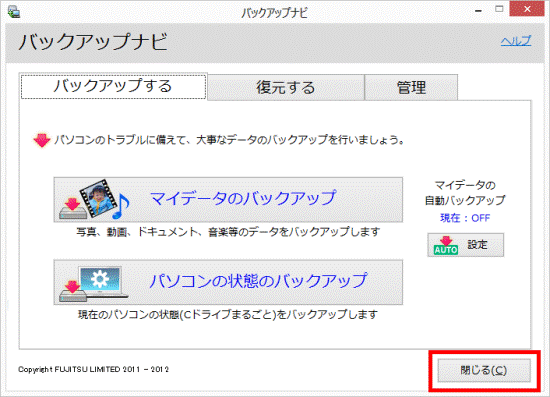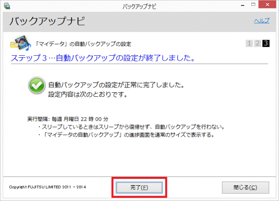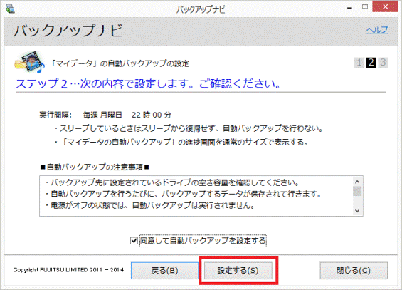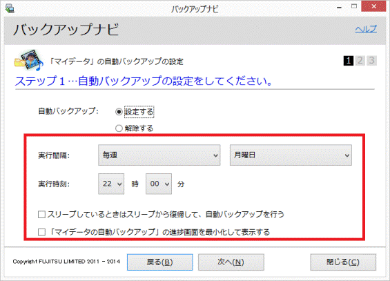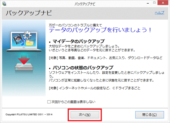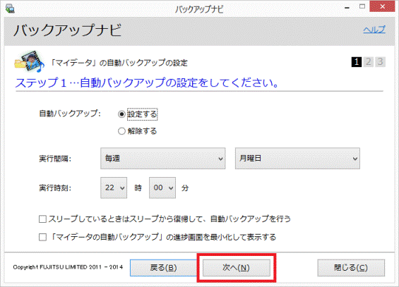 [バックアップナビ] コンピューターがスリープ状態のときにマイデータの自動バックアップができません。 - 「次へ」ボタンをクリックします。
