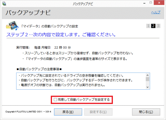 「自動バックアップの注意事項」をよく読み、同意する場合は「同意して自動バックアップを設定する」をクリックし、チェックを付けます。