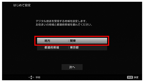 「カーソル」ボタンでお住まいの都道府県を選択し、「決定」ボタンを押します。 - 「カーソル」ボタンで「次へ」を選択し、「決定」ボタンを押します。