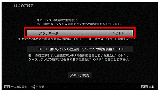 BS・110度CSデジタル放送用アンテナへの電源供給が必要かどうかを教えてださい。 - 「カーソル」ボタンで「スキャン開始」を選択し、「決定」ボタンを押します。