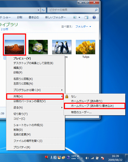 - 共有ファイルを編集できるようにするには、エクスプローラーを起動し、目的のファイルを右クリックして、表示されるメニューから、「共有」→「ホームグループ(読み取り/書き込み)」の順にクリックします。
