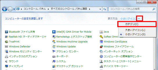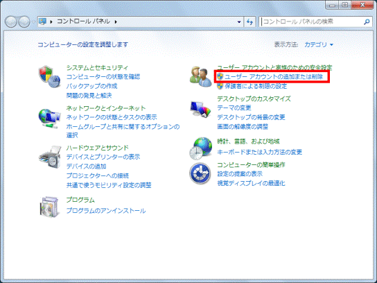 アドバイス「ユーザーアカウントの追加または削除」が表示されていない場合は、「表示方法」の右にある「▼」ボタンをクリックし、表示されるメニューから「カテゴリ」をクリックしてください。