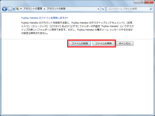 選択したユーザーアカウントの情報を保持する場合は「ファイルの保持」ボタンを、保持しない場合は「ファイルの削除」ボタンをクリックします。