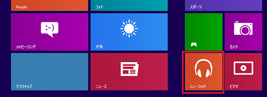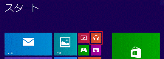 デスクトップの場合は、画面の右下にマウスポインターを移動し、チャームが表示されたら「スタート」をクリックします。 - 「ミュージック」が起動します。