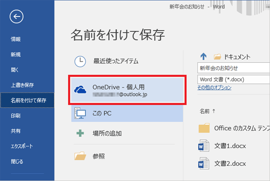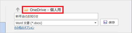「名前を付けて保存」を実行して、保存先にOneDriveを選択します。