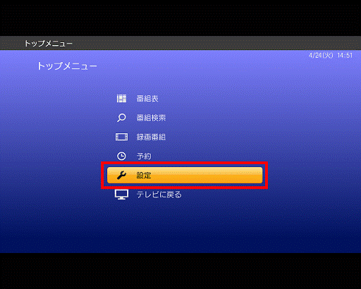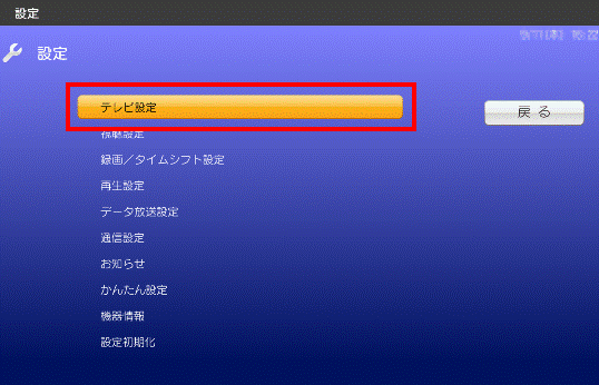 「カーソル」ボタンで「テレビ設定」を選択し、「決定」ボタンを押します。