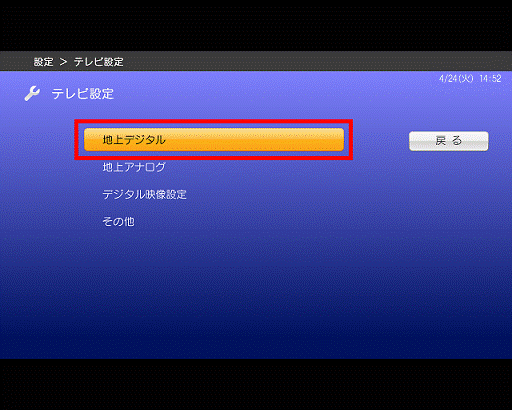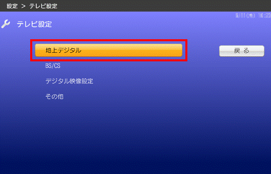 「カーソル」ボタンで「地上デジタル」を選択し、「決定」ボタンを押します。
