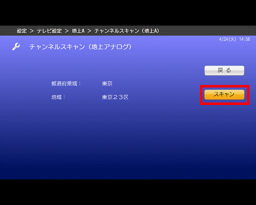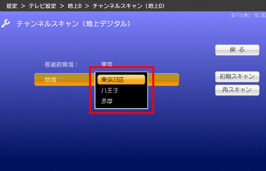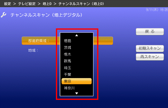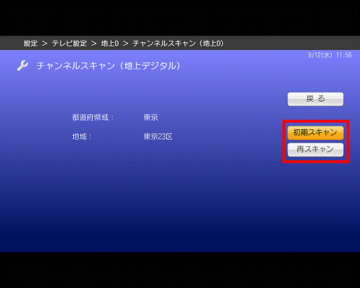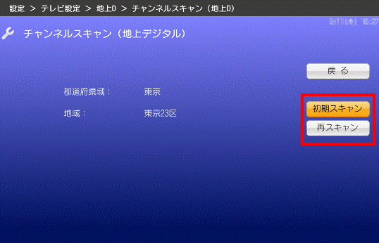 - 「カーソル」ボタンで「初期スキャン」、または「再スキャン」を選択し、「決定」ボタンを押します。