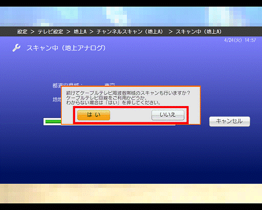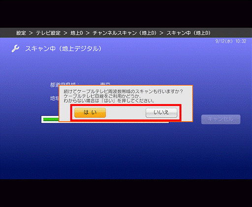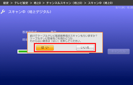 - 「続けてケーブルテレビ周波数帯域のスキャンも行いますか?」と表示されます。