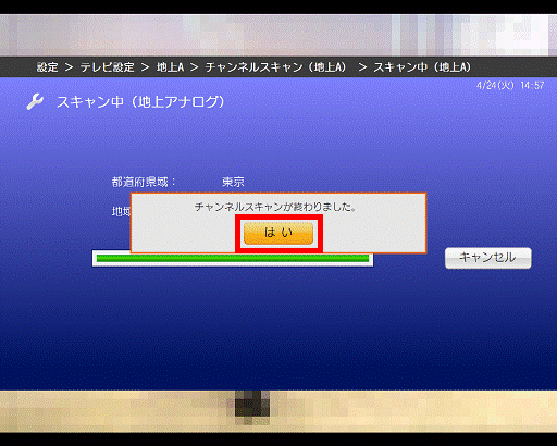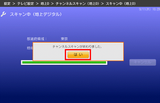 完了するまで、しばらく待ちます。 - 「チャンネルスキャンが終わりました。」と表示されます。