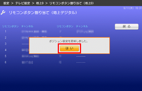 リモコンのボタンに割り当てられた、現在のポジション設定をリセット(初期化)してからチャンネルスキャンを実行します。チャンネルスキャン完了後に、ポジション設定が自動的に割り当てられます。 - 再スキャン