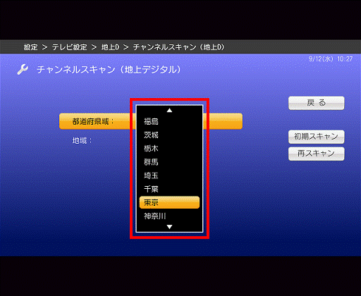 - 「カーソル」ボタンで「地域:」を選択し、「決定」ボタンを押します。