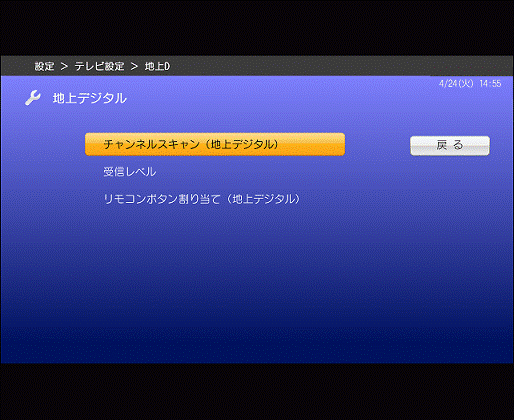 「戻る」ボタンを4回押して視聴画面に戻り、デジタル放送が視聴できることを確認します。