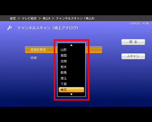 - 「カーソル」ボタンでお住まいの地域を選択し、「決定」ボタンを押します。