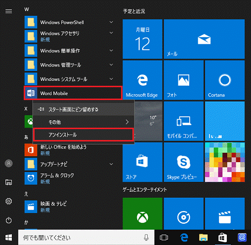 - アプリの一覧から「Word Mobile」を右クリックし、表示されるメニューから「アンインストール」をクリックします。