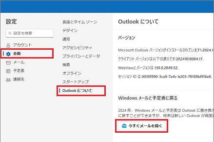「設定」画面の「全般」→「Outlookについて」→「今すぐメールを開く」ボタンの順にクリックします。